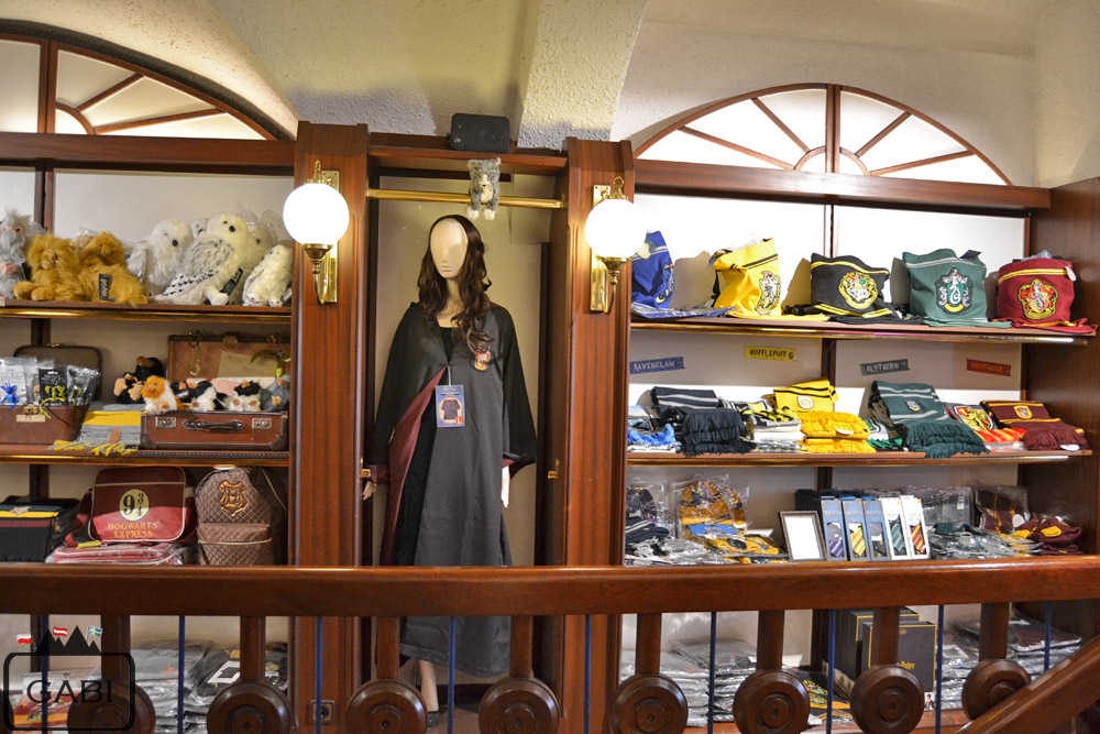 Mimo ładnej pogody nie chcę siedzieć na zewnątrz - interesuje mnie wnętrze kawiarni! Jak na book cafe przystało, półki zastawione są książkami (nie tylko Harrym Potterem, żeby nie było ;) ), ale do tego mamy tu mnóstwo innych drobiazgów, bo Phoenix jest także licencjonowanym sklepikiem z gadżetami ze świata HP. Nad stolikami zawieszone są listy z Hogwartu z nazwiskami bohaterów, a z głośników cicho płynie muzyka z filmu. Możemy wejść też po schodach na górę - obsługa nawet do tego zachęca, w końcu tam wystawiono najwięcej produktów na sprzedaż - by jeszcze bardziej zatonąć w tym magicznym świecie. Wita nas zawieszona nad głowami latająca miotła i jeszcze więcej gadżetów. Widać, że to miejsce przyciąga potterowych fanów, bo w pewnym momencie do kawiarni weszła też kobieta z kilkuletnią córką w spiczastej tiarze, pelerynie z logiem Gryffindoru i drewnianą różdżką w ręku - gotowe na śniadanie ;).